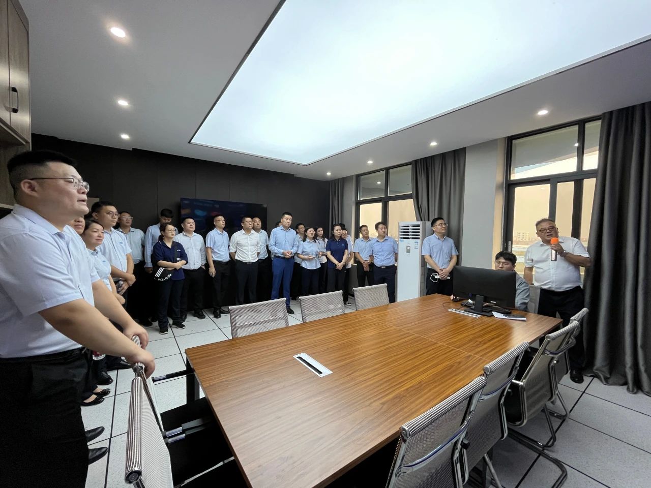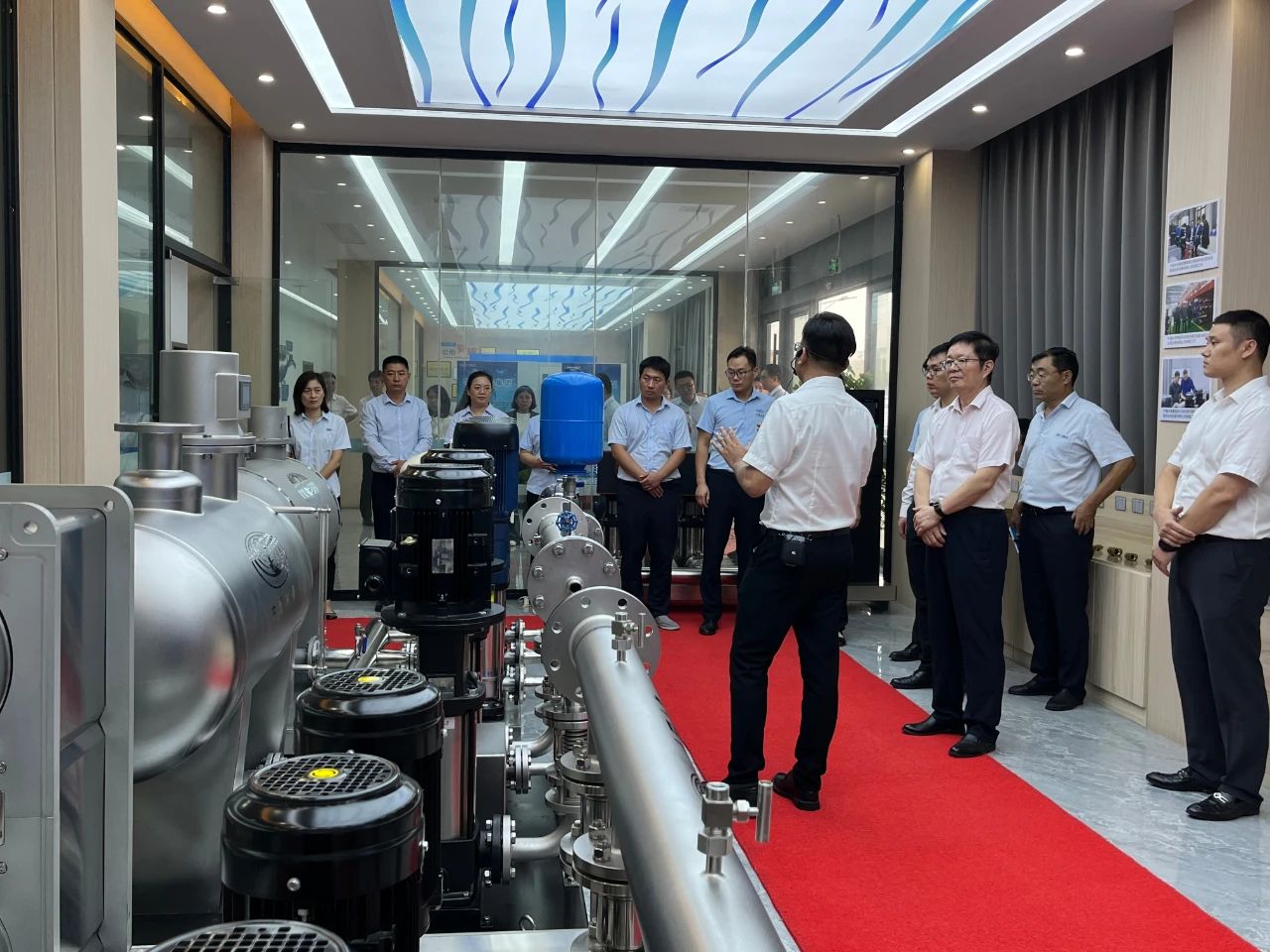 集團郭總在我司講解團的陪同下,帶領(lǐng)集團年輕干部培訓班成員先后參觀了我司機械、電氣生產(chǎn)車間、成品庫、二次供水設(shè)備展廳、二次供水監(jiān)控管理平臺及數(shù)字化智慧水務平臺。